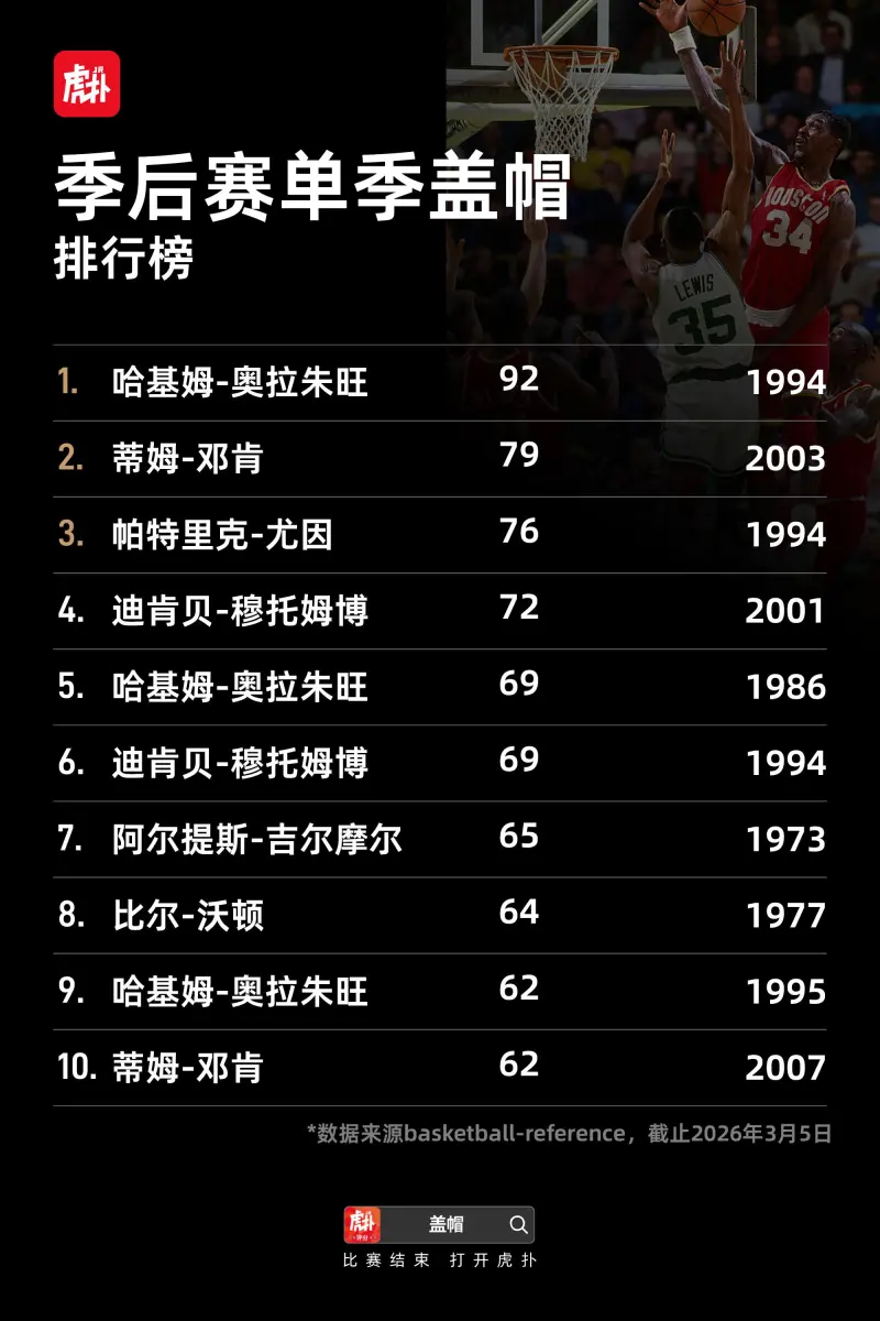 一起来看看常规赛&季后赛盖帽排行榜数据吧