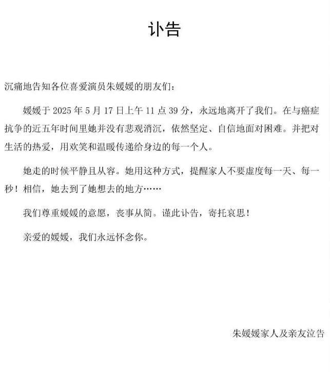 2025年5月17日,辛柏青突然发布讣告,宣布朱媛媛因病去世。